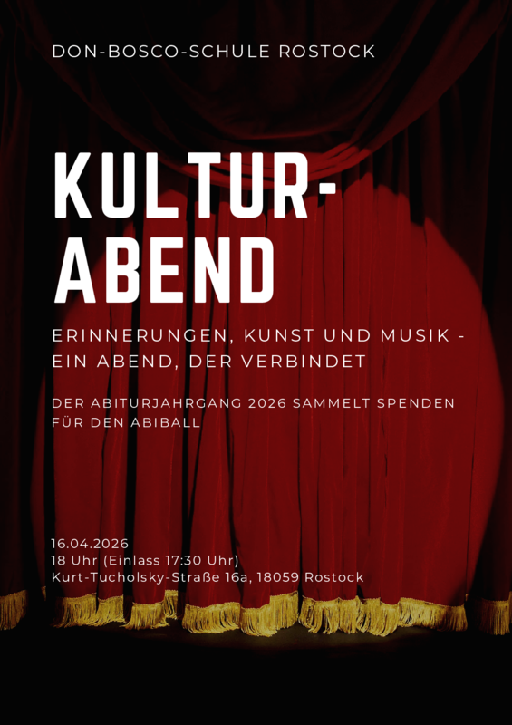 Der 12. Jahrgang, lädt Sie recht herzlich zu seinem Kulturabend ein. An diesem Abend werden die Abiturienten und Abiturientinnen ihre Schulzeit Revue passieren lassen und einige Talente aus dem Jahrgang auf der Bühne zeigen. Gleichzeitig sammeln sie Spenden für ihren Abiball und würden sich sehr über einen kleinen Spendenbeitrag von den Gästen freuen. Seien Sie also gespannt auf Kunst, Musik, Theater und vieles mehr am 16.04.2026 um 18 Uhr im Forum der weiterführenden Don-Bosco-Schule.